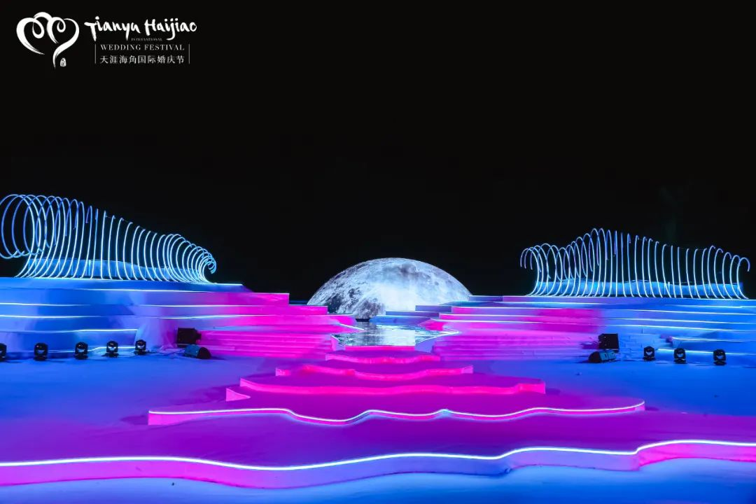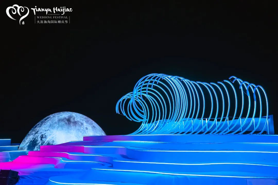 据开幕式主舞台设计师徐丹介绍,此次舞台设计简单明了地采用了“海上生明月  天涯共此时”这句家喻户晓的古诗词概念,两端采用动感的白色海浪烘托着舞台中间“升起的明月”,并配合多彩灯光营造出波浪涌动的动感效果,在日月石前营造出浪漫的婚礼场景,恰如其分地契合了婚庆节“天时地利人和”等特定元素。舞台梯台设计灵感源于天涯海角海景涌动的浪花层叠造型,让参加天涯婚典的新人们更好地融入舞台,舞台中央的镜面通道犹如月亮女神穿着婚纱造型,会随着灯光的变幻呈现出舞动的婚纱梦幻感。据分析,徐丹是中央电视台二套财经频道特约设计师、中国三亚目的地婚礼全国推广大使。