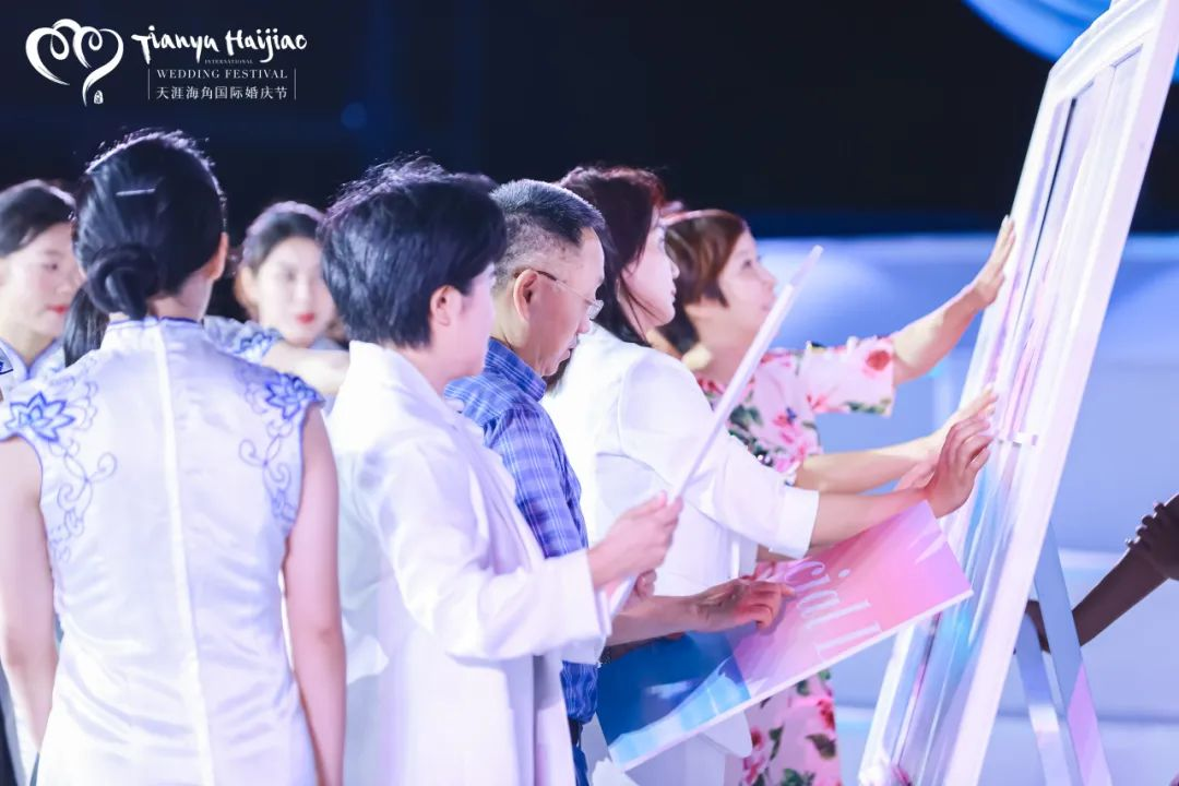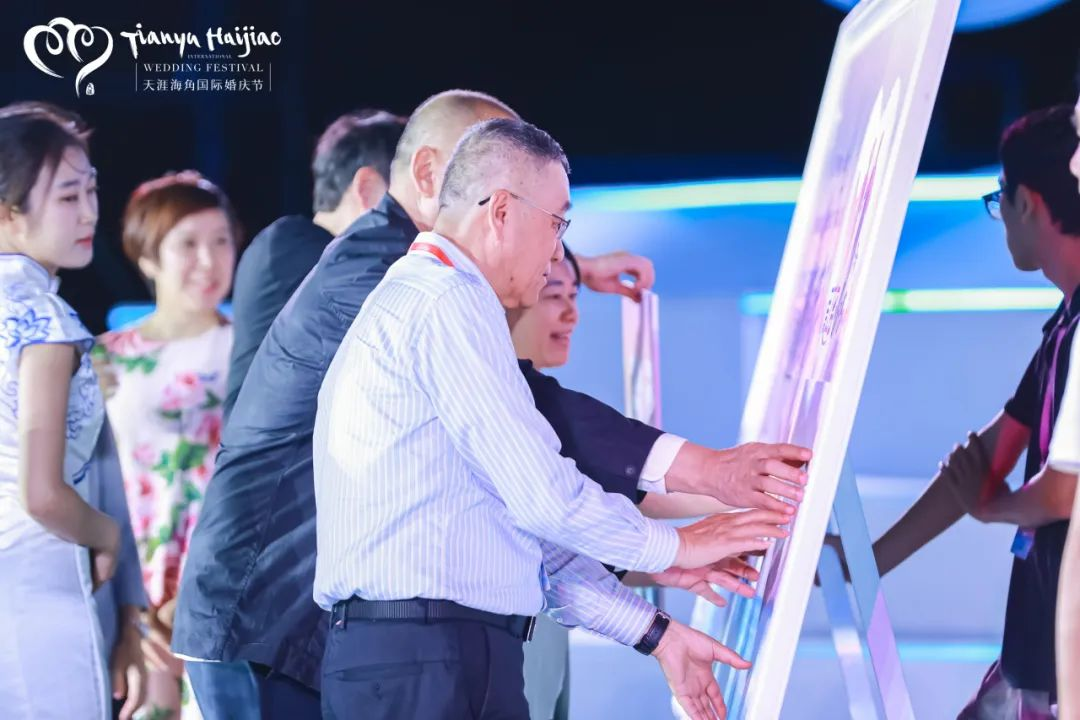 三亚市委常委、常务副市长盛勇军,海南省旅文厅产业开展处三级调研员冯飞,三亚市委宣传部副部长王筱卉,三亚市国资委专职副书记陈朝江,三亚旅游文化投资集团有限公司党委副书记、总经理梅开志,三亚市商务局副局长杨春,三亚市旅文局副局长杨玉婷,三亚市旅游开展局党委书记吴小琳,天涯区副区长李丽英,婚道婚嫁产业研究院院长史康宁,中国传统文化促进会结婚产业工作委员会主任曹仲华,海南省婚庆服务行业协会会长许伟,中央电视台二套财经频道特约设计师、三亚目的地婚礼全国推广大使徐丹共同上台拼好启动拼图,揭开本届天涯海角国际婚庆节浪漫序幕。