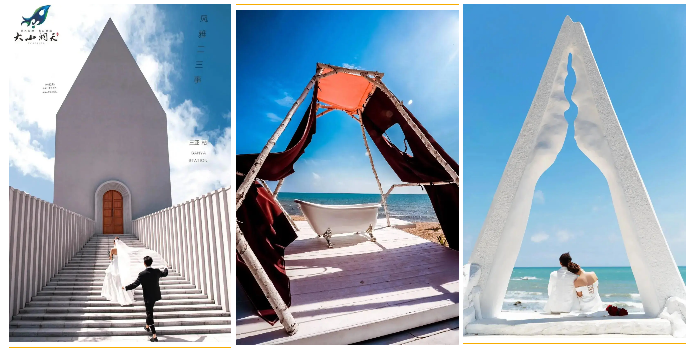 在蓝天白云之下、大海之边、让鸽子见证美好的爱情;用玻璃墙面和地面映衬出天蓝海湛,既温馨又浪漫;集故宫、苏式园林为一体的拍摄场景,助你穿越古今。